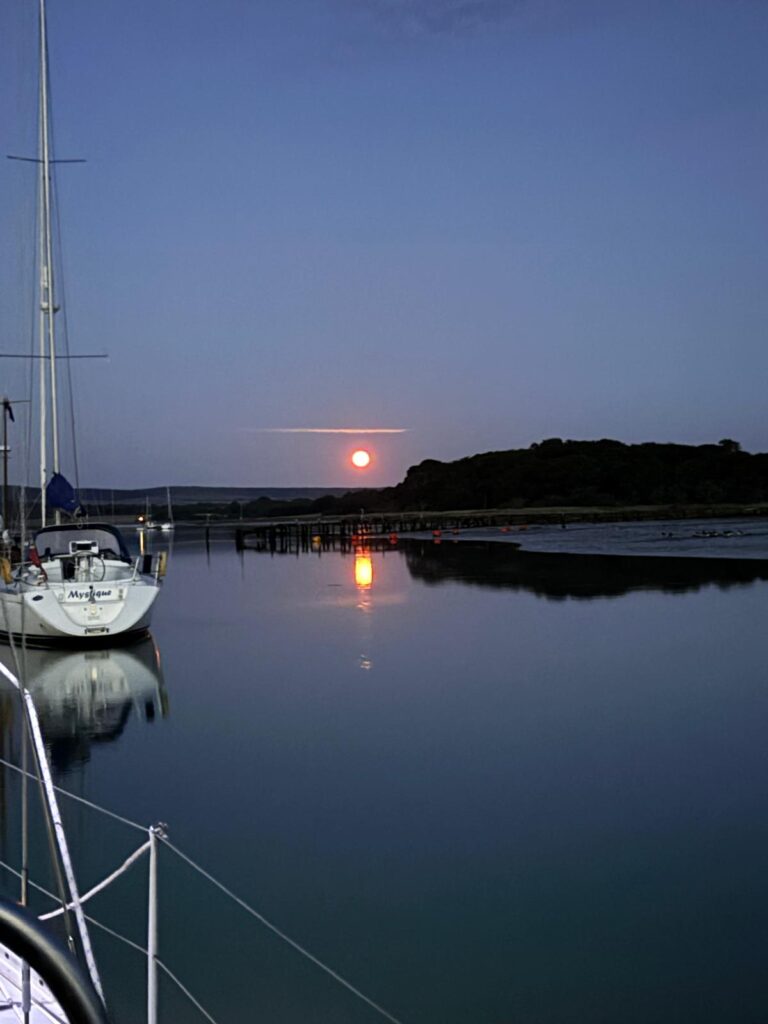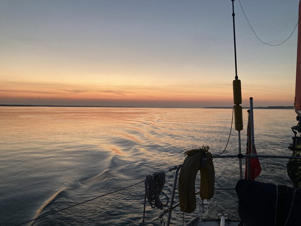 We were up really early at first light to catch the last of the ebb tide through Hurst Narrows. A beautiful dawn, quiet and still. Just made it on time and once out into Poole Bay the tide was against us and with no wind we just pootled along on the engine. We tucked in under Anvil Point to avoid the worst of the tide and as the easterly wind built off Swanage we unrolled the genoa and headed south on a broad reach with the self-steering (Hydrovane aka George) working well. What a relief to be out of the Solent and in the open sea and actually reaching rather than beating!!!!