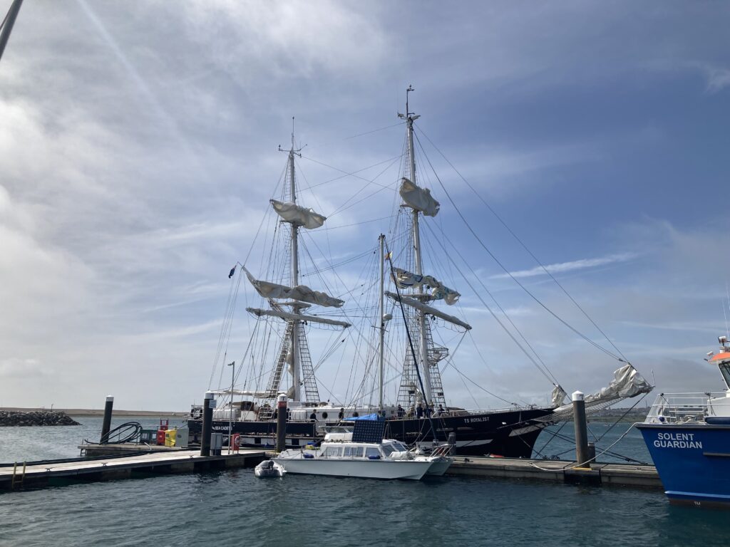 We had to head outside the Lulworth Cove range firing area and the overfalls off St Albans Head so there was no problem heading out to sea on a broad reach. Then a couple of gybes later and we were heading towards Portland Harbour. The wind ended up right astern so we rolled up the genoa and motor-sailed into the harbour. We had intended to anchor in the harbour but it would be really uncomfortable in this wind direction so Anne telephoned the marina and requested a visitor’s berth. It was blowing quite hard by now but helped by the really friendly marina staff, and Anne’s quick work arranging the fenders and mooring lines, we were soon safely moored up head to wind. We were among the early arrivals followed by the Sea Cadets and Maybee 4, Tim and Lucy Barlow from Marchwood YC. Lucy is the Commodore of the Club. The forecast is horrible so we are sure we will be here two nights.
