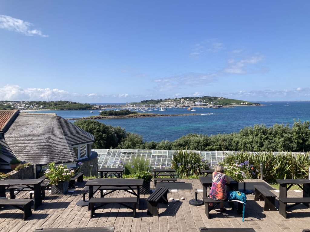 Lots of French boats coming into the anchorage at Porth Cressa but we felt confident to leave Harvard at anchor and headed off for a longish walk around the island. Beautiful sunny weather now with a brisk north westerly breeze. First stop was for coffee, tea and cake with a fantastic view over the harbour.