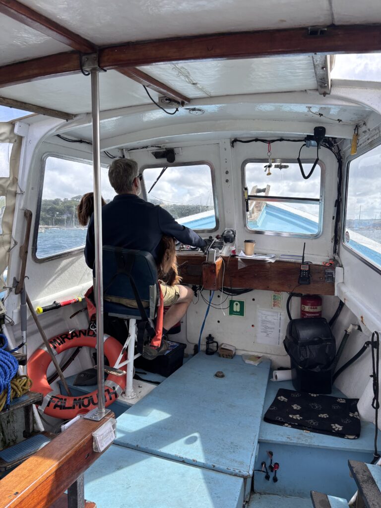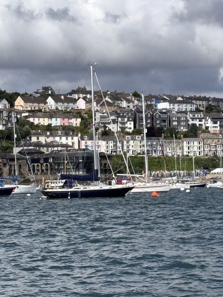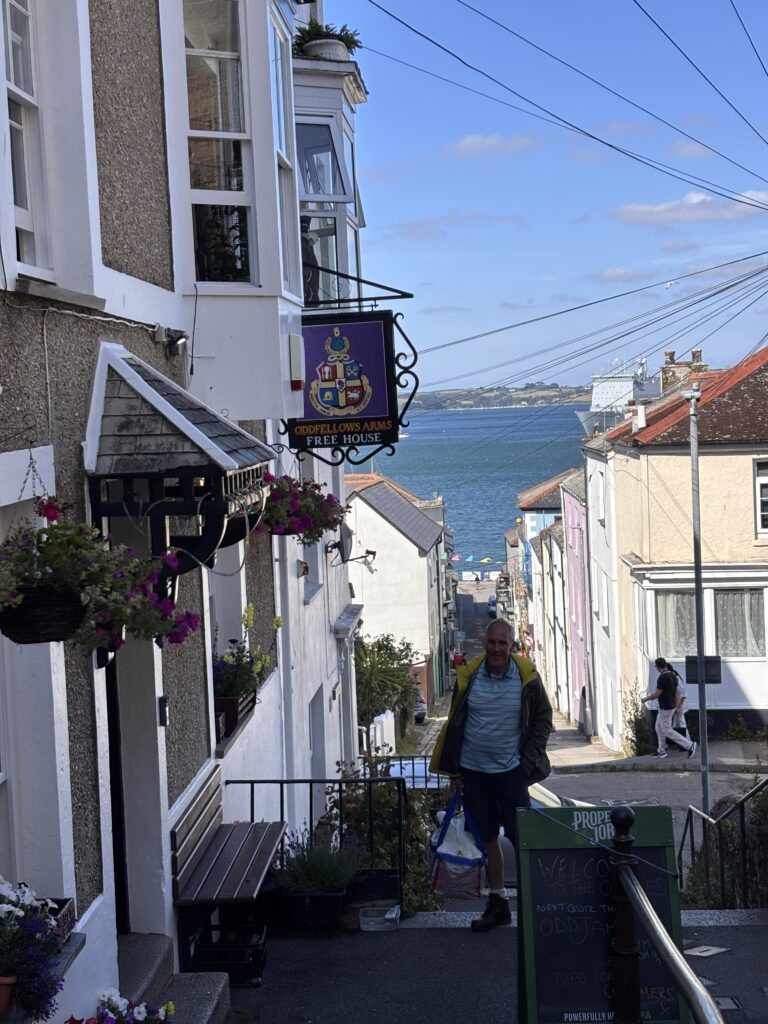 The first thing we did was have a quick shower and took our washing to the service laundrette. It is much more efficient than feeding pound coins into the marina washing machines and tumble driers that never seem to work properly. Then after the usual coffee stop and a little bit of shopping we took the ferry over to Flushing and walked over the hill to Mylor marina where our friends Tony, Alethea and dog Winnie have their boat that they are in the process of selling. We had a lovely lunch with them, catching up on all their news and then walked back to Flushing along the coast to take the ferry back to Falmouth.
