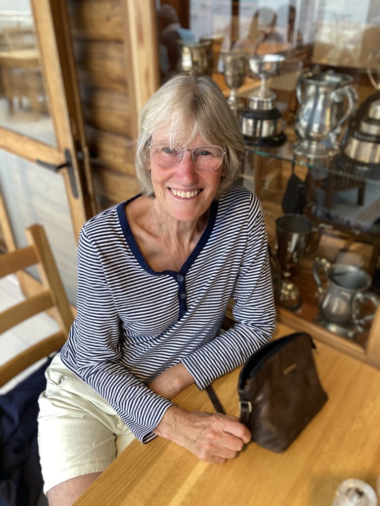 Richard was determined to have his “slap up” meal at the sailing club, so after sorting ourselves out onboard Harvard we first tried to land on a beach nearby and walked to the sailing club but soon gave up on that idea and took the dinghy all the way to the sailing club pontoon. Having a hot shower after being wet all day was bliss and then it was time to have a really great meal and drinks. Fantastic steaks! Then we headed back in the mist as it became dark after a good day, despite the weather.