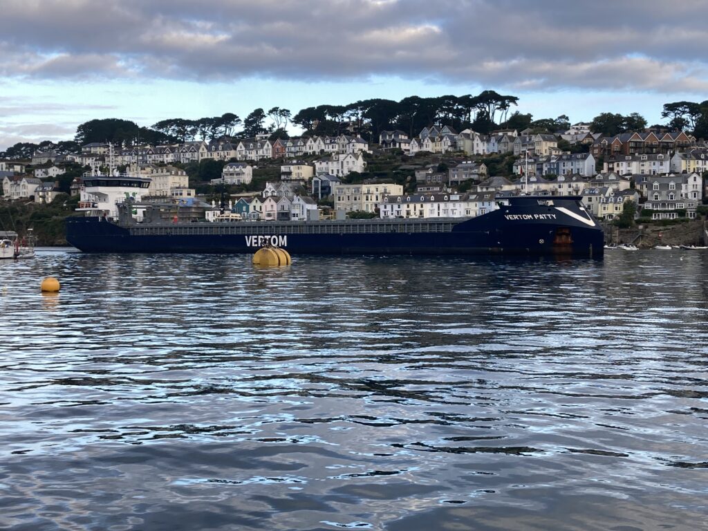 Woke up to find a big (for Fowey) ship coming in to collect china clay. The wind was forecast to be west to southwest. We hoisted the mainsail in the harbour and once outside Richard decided to use the cruising chute (a kind of spinnaker) as the wind angle was just right for this sail. At first it was the right decision as it added 1 knot to our speed and we were regularly going at over 6 knots touching 7 knots through the water with the Hydrovane steering.